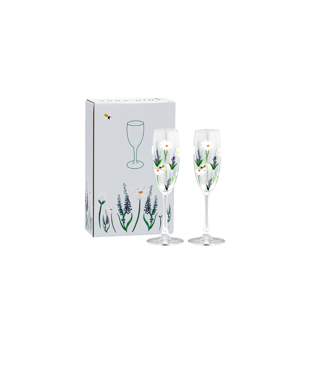 Set de 2 flûtes à champagne peintes à la main, décorées de fleurs printanières et d’abeilles délicates. L’accessoire idéal pour célébrer chaque instant avec élégance et poésie.