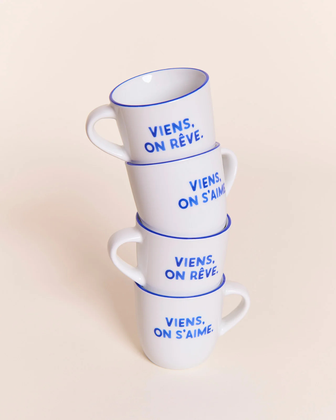 Composé de deux tasses espresso et leurs sous-tasses assorties, ce set séduit par son design délicat et moderne. Les messages “Viens on rêve” et “Viens on s’aime”, imprimés en coup de pinceau et imaginés par le studio émoi émoi, apportent une touche artistique et poétique à votre rituel café.