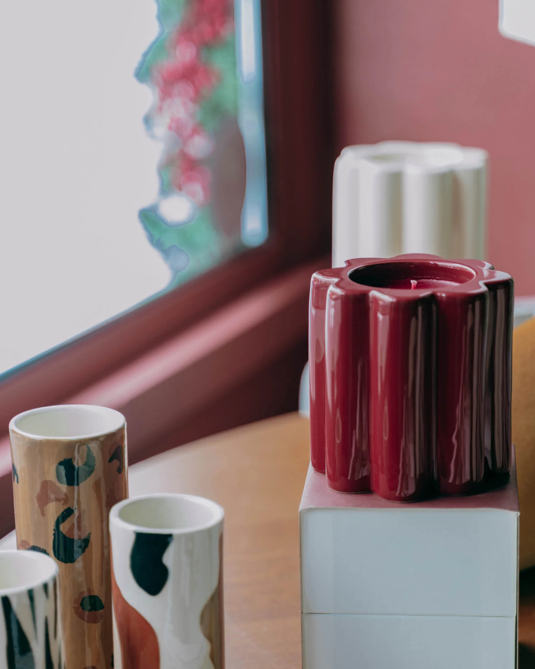 Son contenant en céramique bordeaux, fabriqué au Portugal, apporte une touche décorative forte et élégante. Sa teinte profonde et intense contraste subtilement avec la douceur de la flamme, faisant de cette bougie un véritable objet de décoration, même lorsqu’elle est éteinte. Avec ses dimensions de 10 cm de hauteur pour 11 cm de diamètre, elle trouve naturellement sa place sur une table basse, une console ou une étagère.