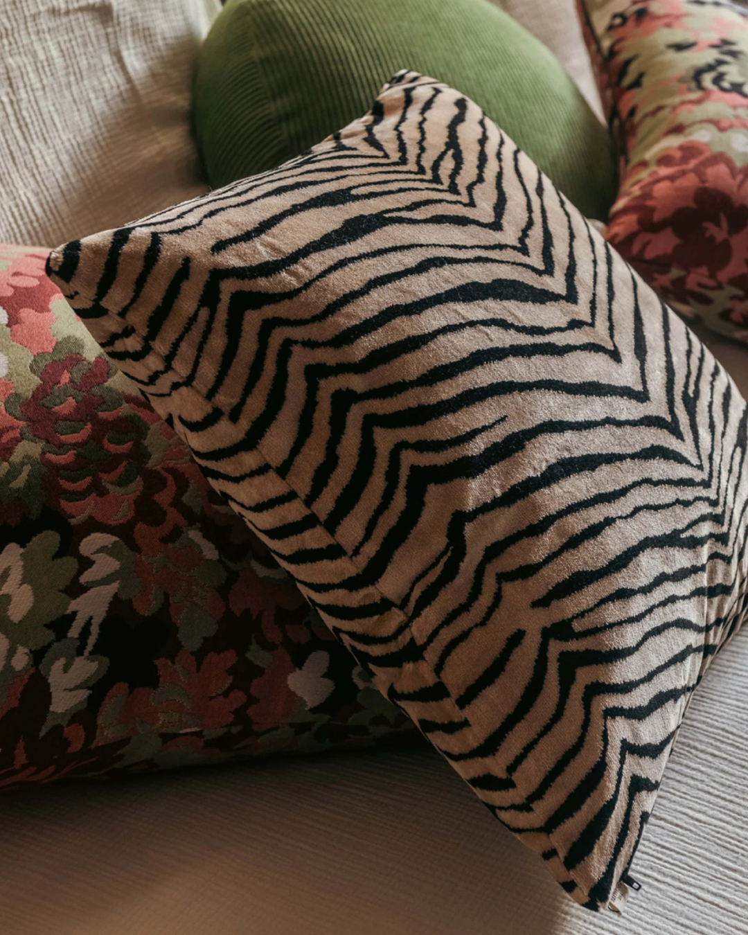 Le Coussin Carino en Velours – Tigre  est une pièce décorative forte qui insuffle caractère et sophistication à votre intérieur. Son motif tigre en velours jacquard capte la lumière et révèle une profondeur textile élégante et graphique.