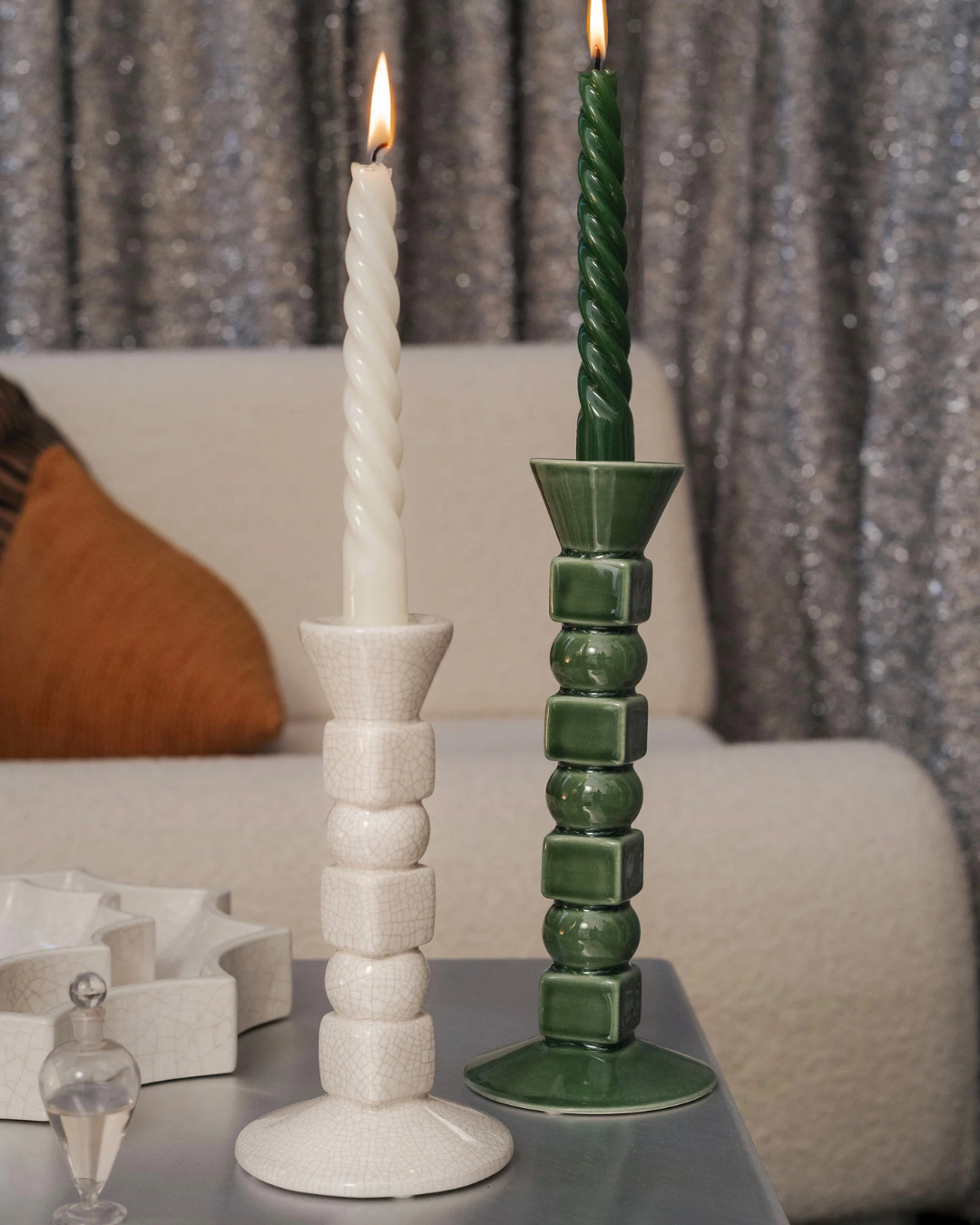 Réalisé en céramique avec une finition en émail brillant craquelé, ce bougeoir séduit par son aspect délicatement texturé et ses nuances subtiles. Le blanc crème, doux et lumineux, s’intègre facilement dans tous les styles d’intérieur, du plus minimaliste au plus sophistiqué. Chaque pièce révèle de légères variations, renforçant son caractère unique et artisanal.