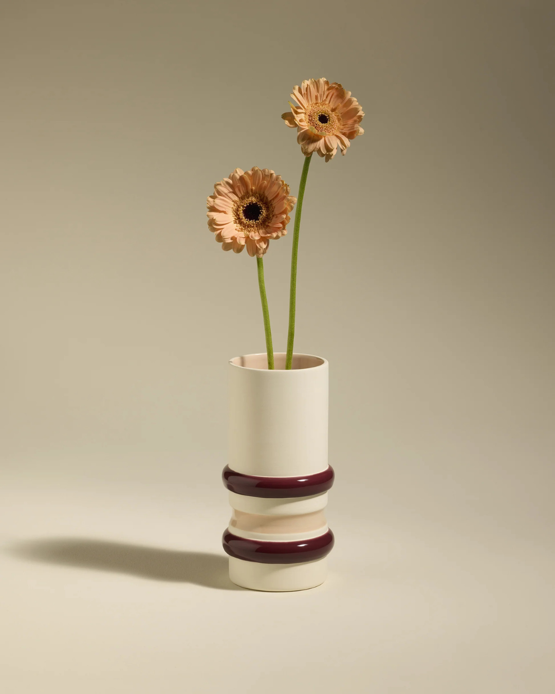 Élégant et sculptural, le vase Aquarius Rose & Aubépine séduit par sa silhouette tubulaire en céramique et ses trois anneaux émaillés brillants qui évoquent les ondulations de l’eau.