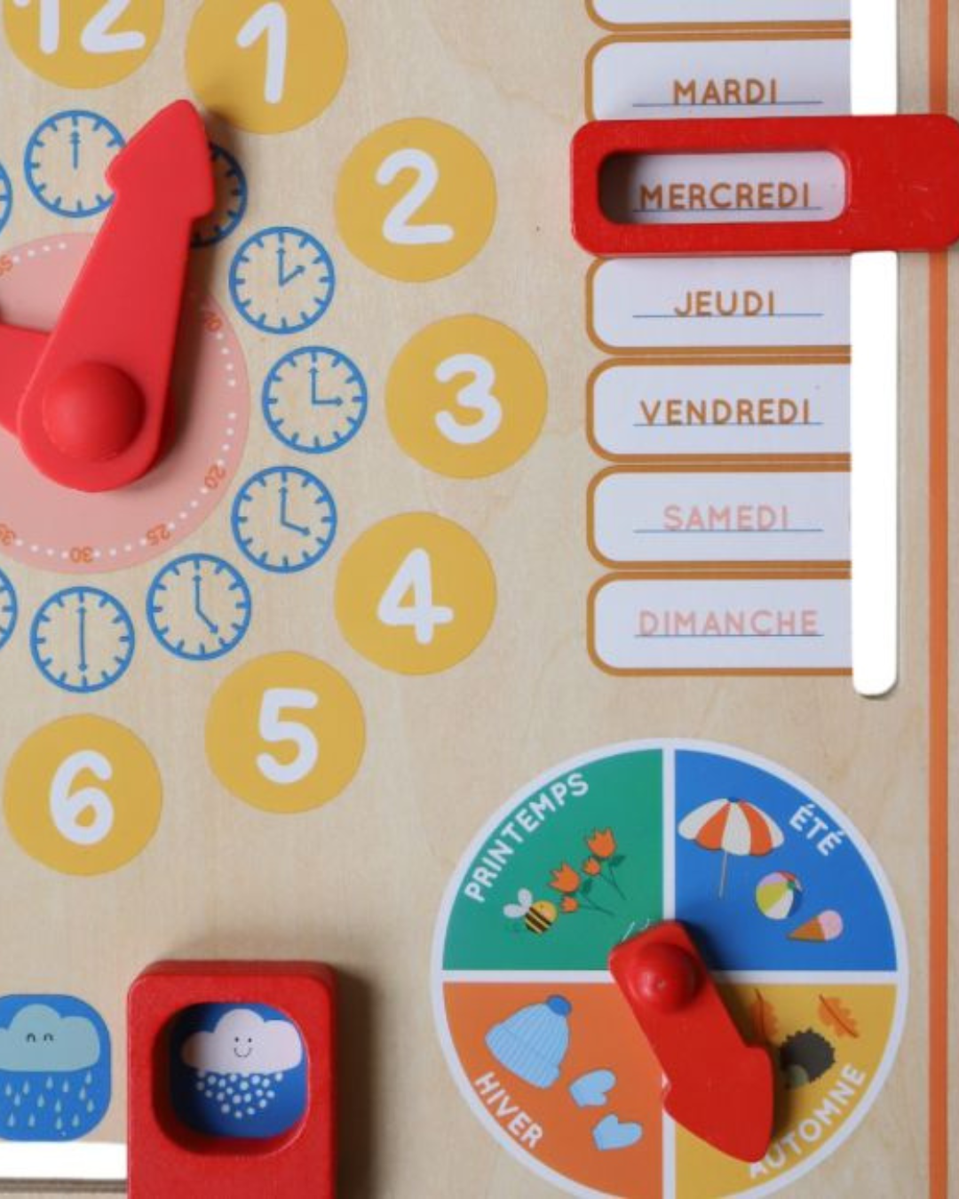 Ce calendrier journalier est un excellent support pour instaurer des rituels du matin : choisir la date, indiquer la météo, déplacer les aiguilles… Une activité éducative et sensorielle idéale pour stimuler la mémoire, la logique et la curiosité.