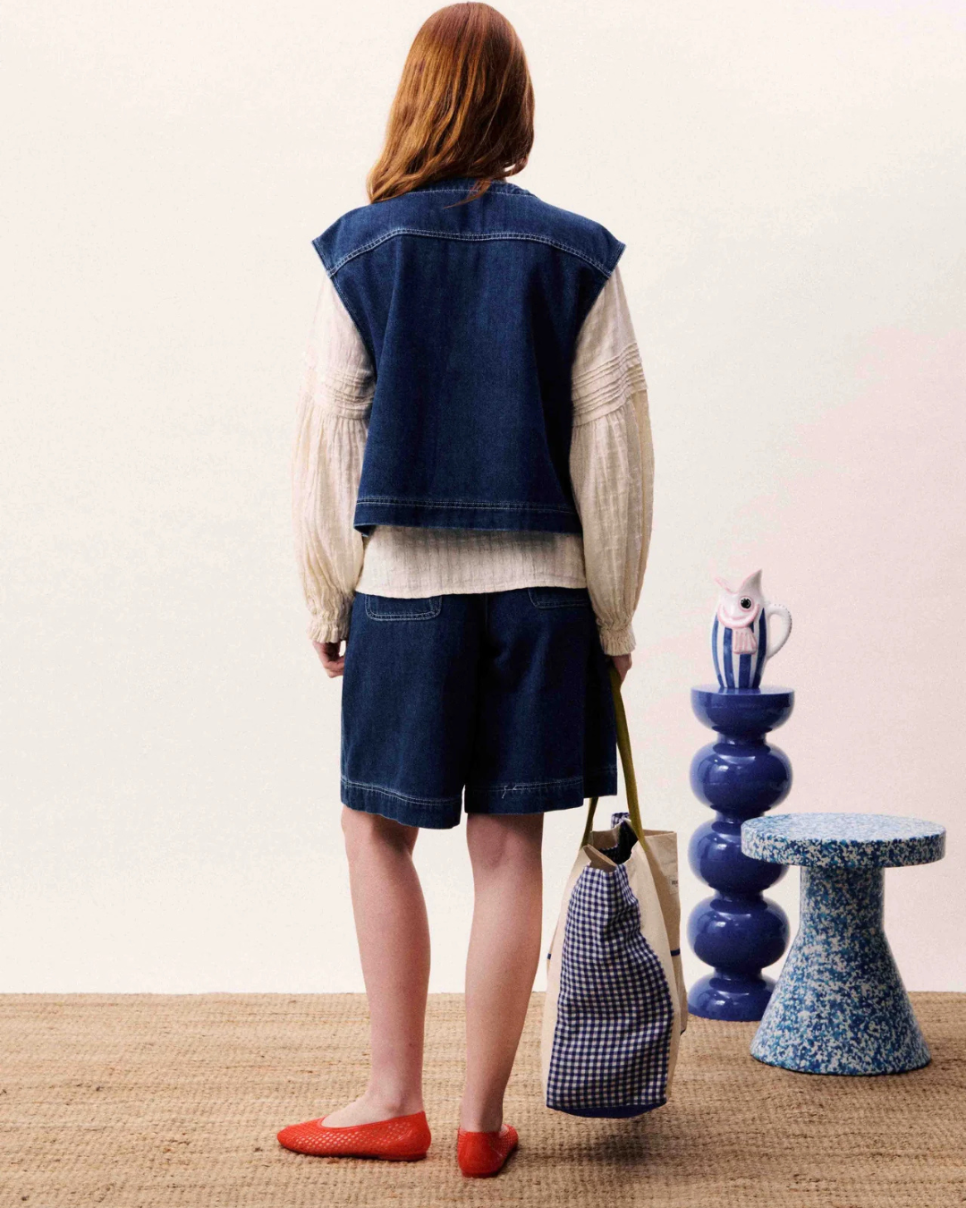 Sa finition denim indigo délavé lui confère un style casual chic facile à associer : sur une chemise blanche, un t-shirt, une robe ou même un total look denim pour une silhouette affirmée. Polyvalent, il se porte en toute saison et s’intègre parfaitement dans un dressing féminin contemporain.