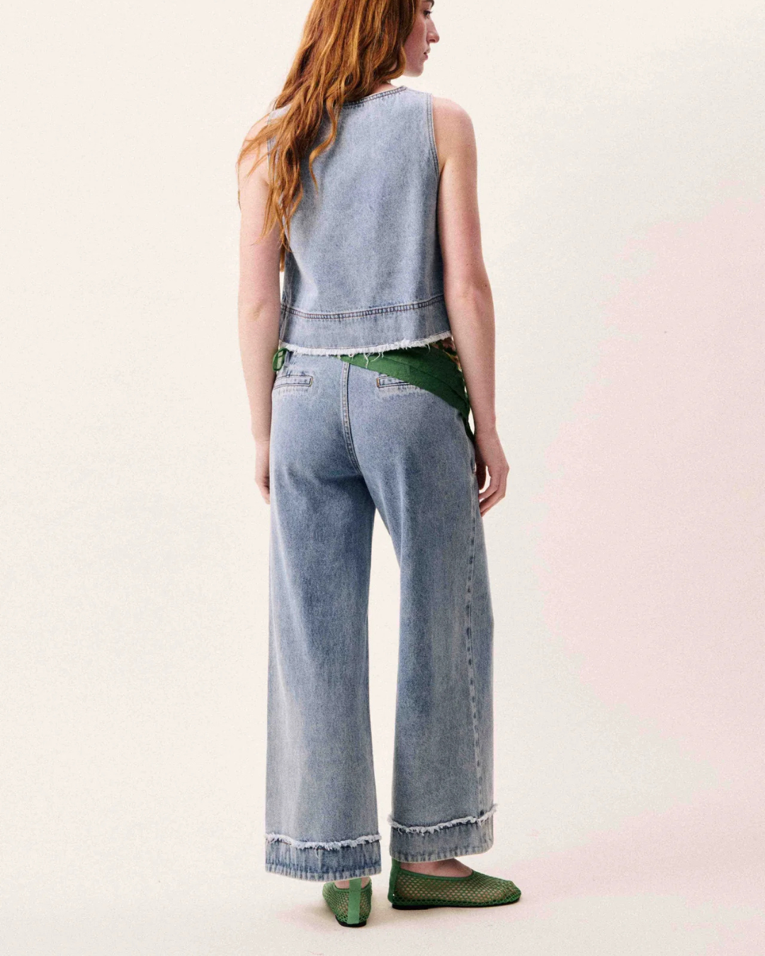 Sa coupe large et fluide sublime la silhouette en allongeant la jambe, tandis que la taille haute met en valeur la taille et structure la tenue. La fermeture par bouton et zip assure un maintien parfait, et les deux poches plaquées à l’avant apportent une touche pratique et stylée. Les ourlets avec finitions effilochées ajoutent une note mode subtilement décontractée.