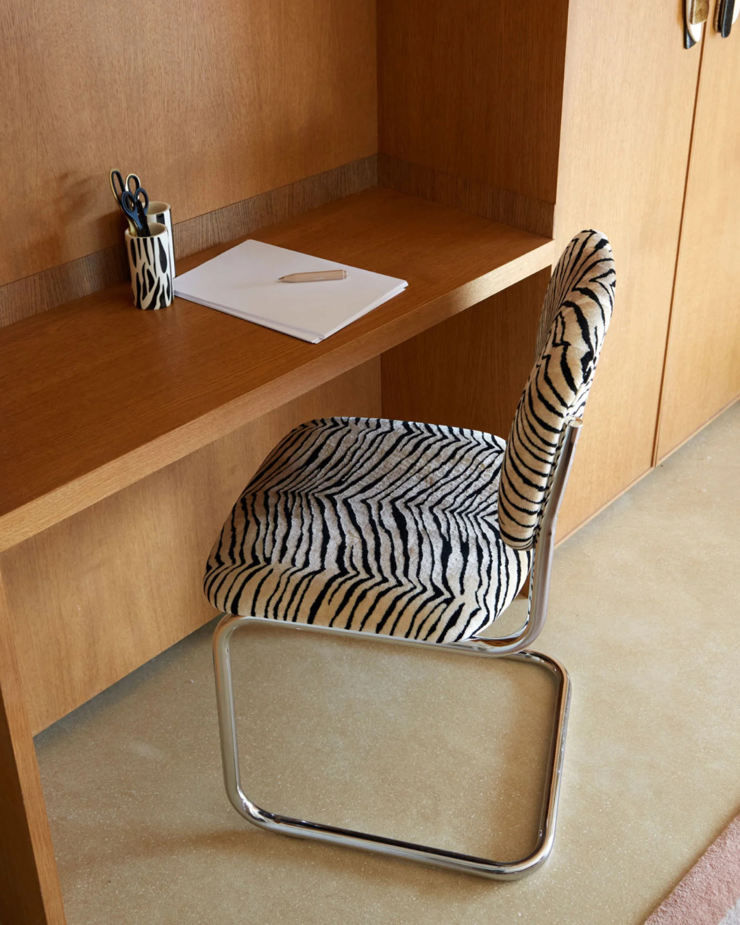 La Chaise Classica en Velours – Tigre est une pièce forte qui associe élégance italienne et audace décorative. Son assise en velours jacquard au motif tigre attire immédiatement le regard et apporte une touche graphique affirmée à votre intérieur.